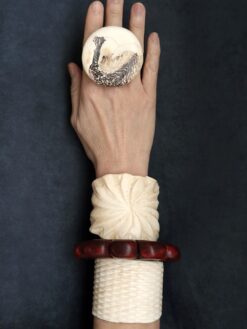 Vegan Ivory Jewellery: Clean with damp cloth or rinse gently in cold water. Do not leave the pieces lying in direct sunlight or expose them to high temperatures, such as saunas, incandescent bulbs in glass cases, vehicles standing in the sun or dishwashers. If you care for your pieces, they will give you many years of joy!