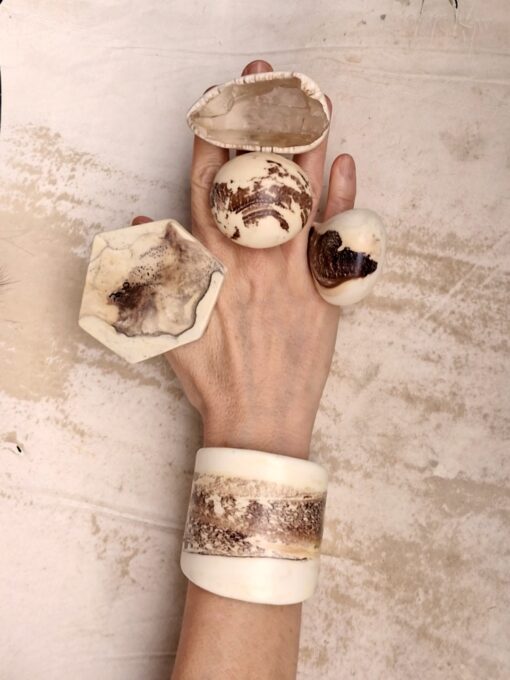 Vegan Ivory Jewellery: Clean with damp cloth or rinse gently in cold water. Do not leave the pieces lying in direct sunlight or expose them to high temperatures, such as saunas, incandescent bulbs in glass cases, vehicles standing in the sun or dishwashers. If you care for your pieces, they will give you many years of joy!