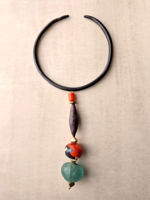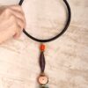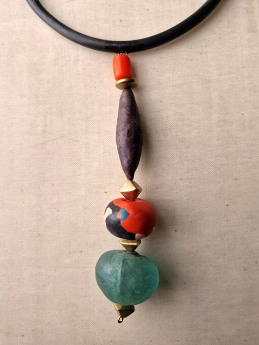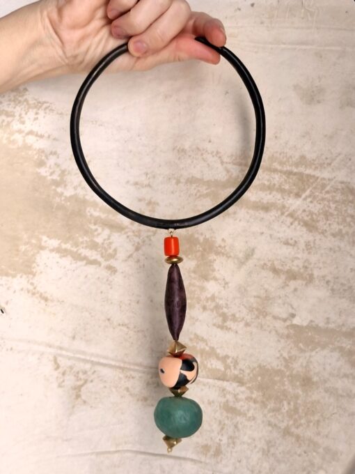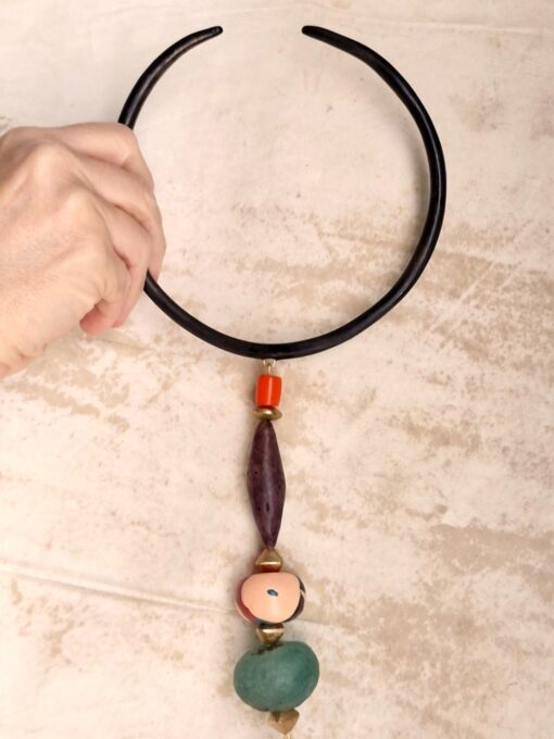 Black Collar Necklace with Multicolored Bead Pendant – Adjustable Size