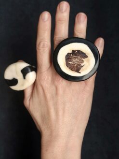Vegan Ivory Jewellery: Clean with damp cloth or rinse gently in cold water. Do not leave the pieces lying in direct sunlight or expose them to high temperatures, such as saunas, incandescent bulbs in glass cases, vehicles standing in the sun or dishwashers. If you care for your pieces, they will give you many years of joy!