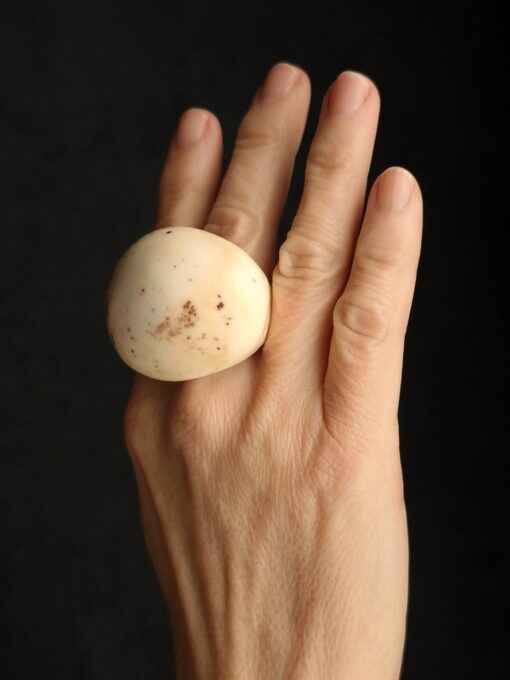 Vegan Ivory Jewellery: Clean with damp cloth or rinse gently in cold water. Do not leave the pieces lying in direct sunlight or expose them to high temperatures, such as saunas, incandescent bulbs in glass cases, vehicles standing in the sun or dishwashers. If you care for your pieces, they will give you many years of joy!