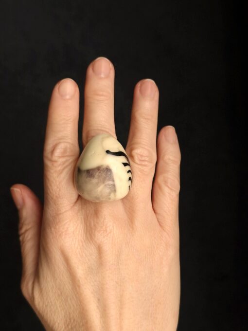 Vegan Ivory Jewellery: Clean with damp cloth or rinse gently in cold water. Do not leave the pieces lying in direct sunlight or expose them to high temperatures, such as saunas, incandescent bulbs in glass cases, vehicles standing in the sun or dishwashers. If you care for your pieces, they will give you many years of joy!
